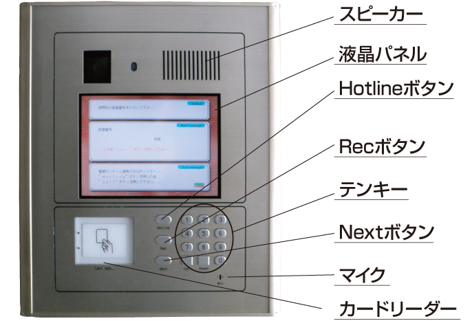 なお、管理センターからのメッセージや預かりロッカーに荷物がある場合は、カードをカードリーダーに当てると『メッセージをお預かりしております。』という音声ガイダンスと同時に、液晶画面にメッセージが表示されます。メッセージを確認した後、Nextボタンを押すとオートロックが解錠されます。情報が複数ある場合、Nextボタンを複数回押します。